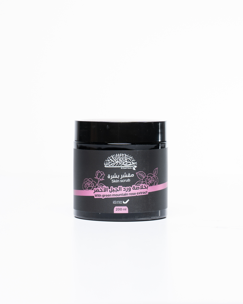 A luxurious scrub enriched with Omani Green Mountain rose extract, featuring a rich formula of natural rose extracts known for their nourishing and soothing benefits for the skin.